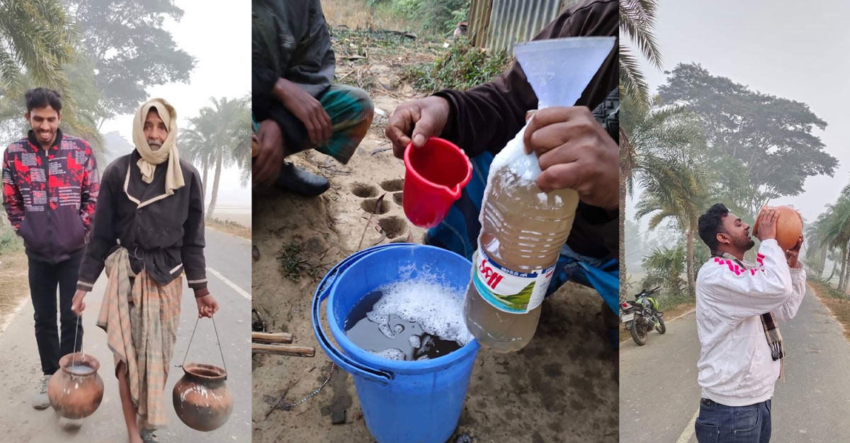 মেহেদী হাসানের মতো এখানে আসা কয়েকজন তরুণ প্রথমবার গাছ থেকে নামানো টাটকা খেজুরের রসের স্বাদ গ্রহণ করেন এদিন। এদের মধ্যে রয়েছেন শেরপুর শহর থেকে আসা শিক্ষার্থী খোকন আহমেদ ও তার বন্ধুরা।