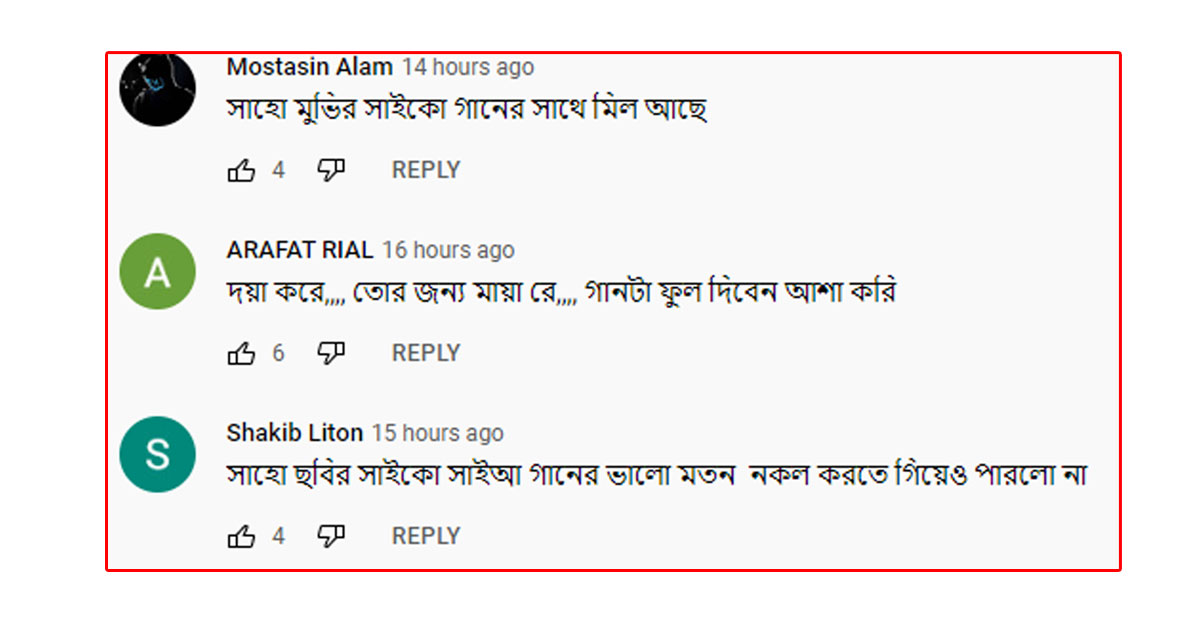 এদিকে ওটটি প্ল্যাটফর্ম আই থিয়েটারের ইউটিউব চ্যানেলে মন্তব্যের ঘরে মোস্তাসিন আলম নামে একজন লিখেছেন— ‘সাহো’ সিনেমার ‘সাইকো’ গানের সঙ্গে মিল আছে।