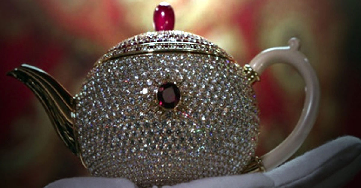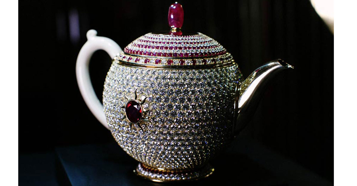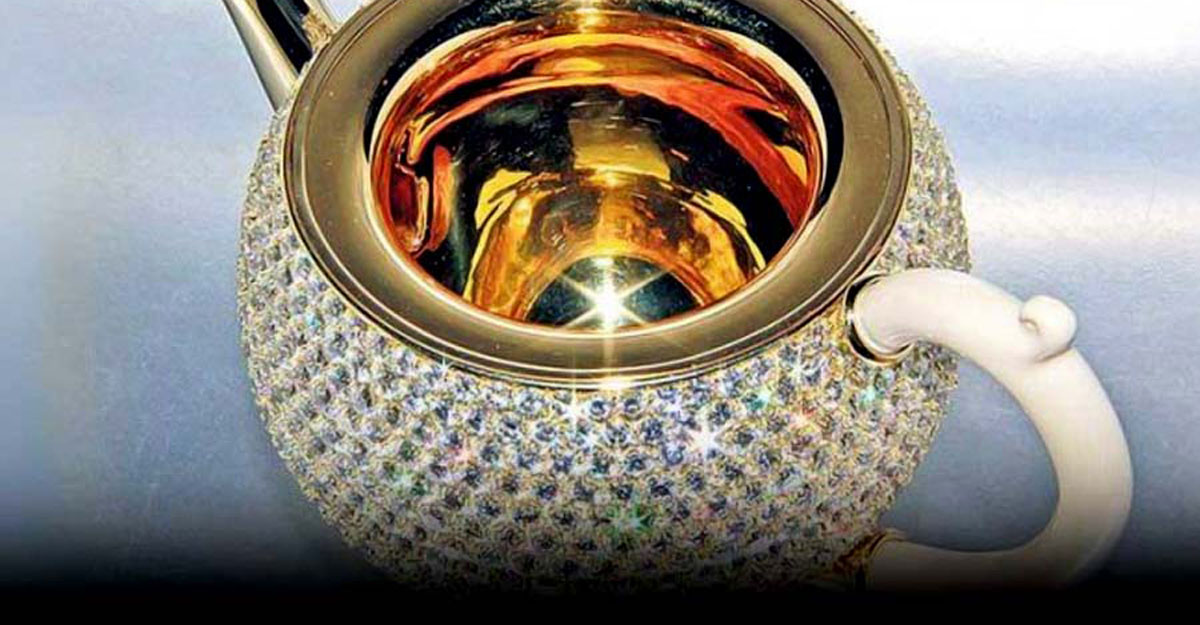 কেটলির হাতলটি সাদা রঙের। বাকি চেহারায় জ্বলজ্বল করছে মণি-মুক্তো। সোনা, হীরা দিয়ে কেটলিটিকে মুড়ে ফেলা হয়েছে।