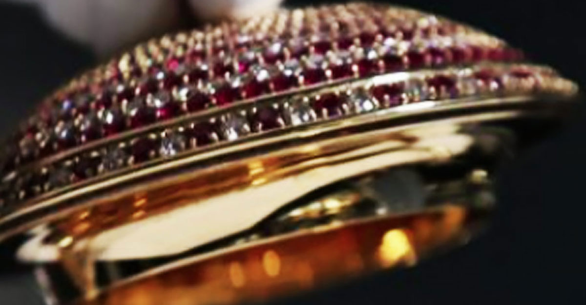 কেটলির ভিতরের অংশটি পিতলের মতো চকচকে। ঢাকনাটিও সোনা ও হীরা দিয়ে বাঁধানো।