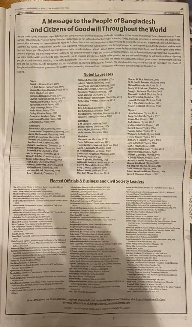 অধ্যাপক মুহাম্মদ ইউনূসকে অভিনন্দন জানিয়ে যুক্তরাষ্ট্রের ওয়াশিংটন পোস্টে একটি বিজ্ঞাপন ছাপানো হয়েছে। এই বিজ্ঞাপনটি নোবেল বিজয়ী, নির্বাচিত প্রতিনিধি, ব্যবসায়ী ও সুশীল সমাজের নেতাদের পক্ষ থেকে প্রকাশিত হয়েছে।