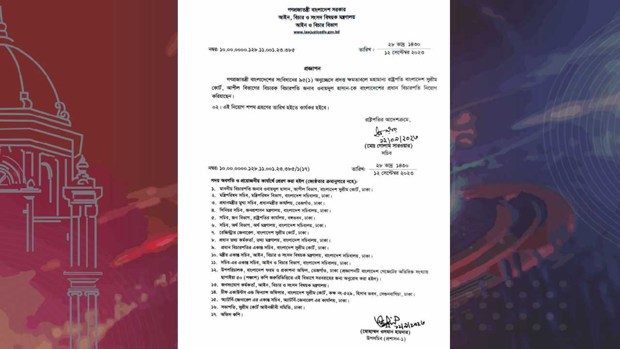 মঙ্গলবার (১২ সেপ্টেম্বর) বিকেলে আইন মন্ত্রণালয় থেকে জারি করা প্রজ্ঞাপনে তাকে প্রধান বিচারপতি হিসেবে নিয়োগ দেওয়ার কথা জানানো হয়।