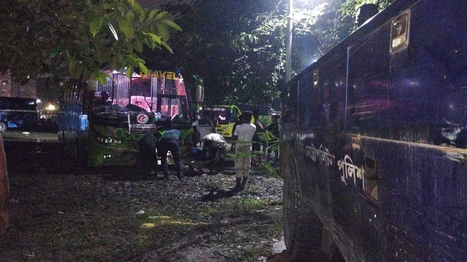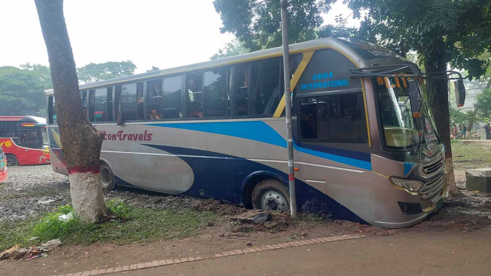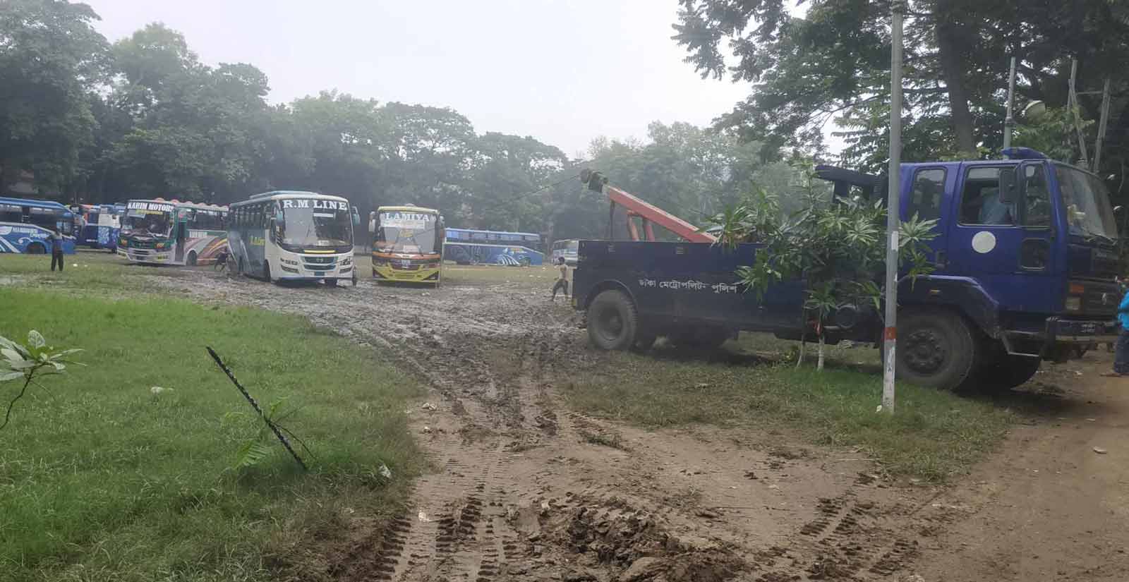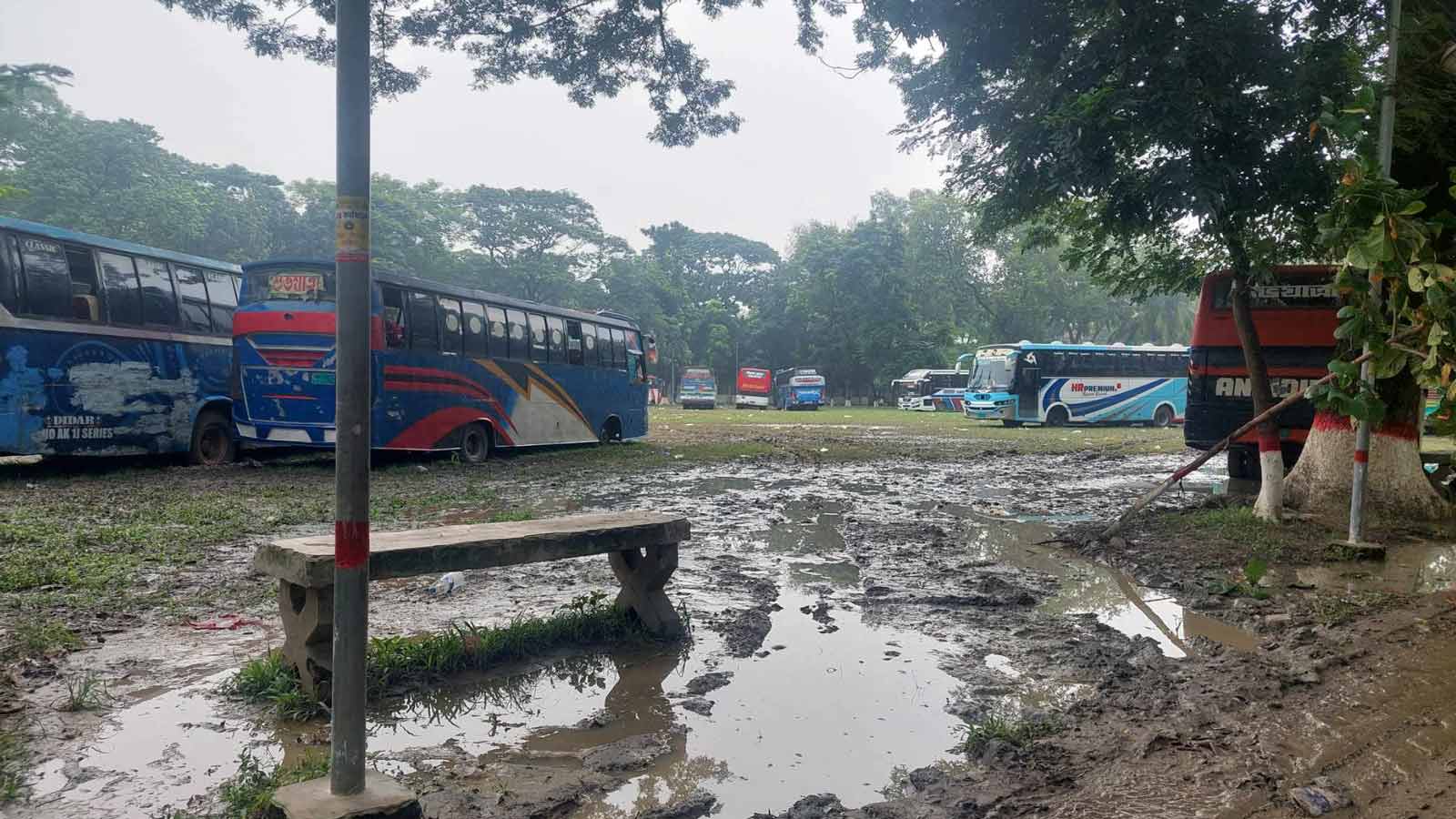 শনিবার (২ সেপ্টেম্বর) দুপুরে ঢাকা কলেজ মাঠ ঘুরে দেখা যায়- সেখানে অনেকগুলো বাস আছে। যেগুলো কাদায় দেবে গেছে। পুরো মাঠজুড়ে কাদা আর বড় বড় গর্তের সৃষ্টি হয়েছে। অনেক গর্তে পানি জমে আছে।