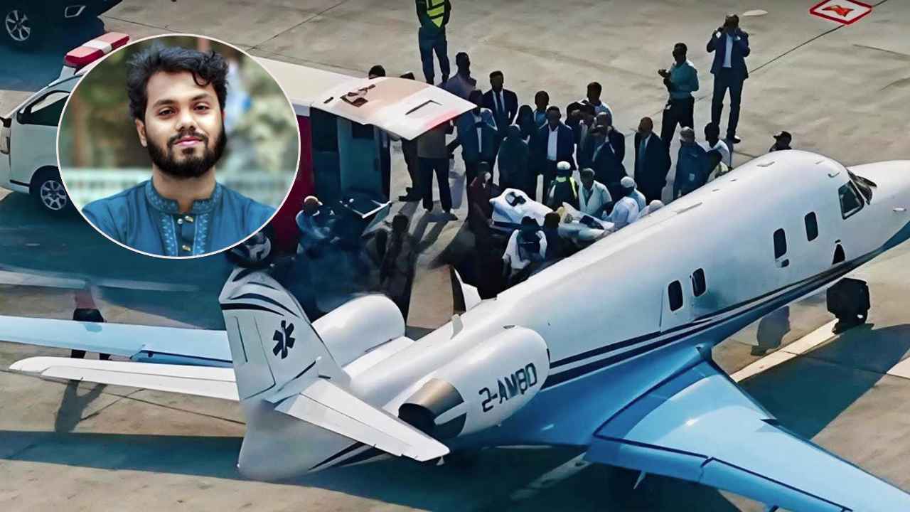 হাদিকে সিঙ্গাপুরে নিয়ে যেতে এয়ার অ্যাম্বুলেন্সটি আজ বেলা ১১টা ২২ মিনিটে হজরত শাহজালাল আন্তর্জাতিক বিমানবন্দরে অবতরণ করে।