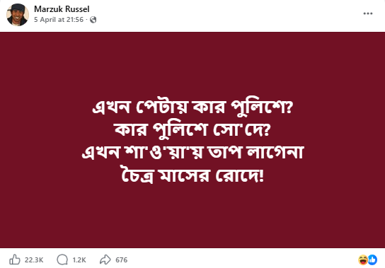 বাংলাদেশের জনপ্রিয় কবি, গীতিকার ও অভিনেতা মারজুক রাসেল। সম্প্রতি, নিষিদ্ধ সংগঠন বাংলাদেশ ছাত্রলীগের সাবেক সহ-সভাপতি কোহিনুর আক্তার রাখিকে “এখন পেটায় কার পুলিশে? কার পুলিশে সো’দে? এখন শা’ও’য়া’য় তাপ লাগে না চৈত্র মাসের রোদে!” শীর্ষক বাক্য যুক্ত একটি পোস্ট শেয়ার করতে দেখা যায়। কোহিনুর আক্তার রাখি যে পোস্টটি শেয়ার করেছেন সেই পেজটির নাম “Marzuk Russel”। পেজেটিতে ফলোয়ার রয়েছে প্রায় ৫৬ হাজার।