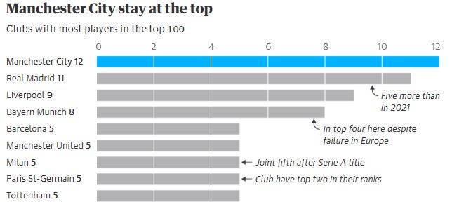 তাছাড়াও দ্য গার্ডিয়ানের প্রকাশিত তালিকায় সেরা দশের মধ্যে রয়েছেন কেভিন ডি ব্রুইনে, রবার্ট লেভানডভস্কি, ভিনিসিয়াস জুনিয়র, থিবো কোর্তোয়া ও মোহাম্মদ সালাহ। সেরা ১০০ জনের তালিকায় ম্যানসিটির ১২, রিয়াল মাদ্রিদের ১১, লিভারপুলের ৯, ম্যানইউ-পিএসজি-বার্সেলোনার ৫ জন করে ফুটবলার রয়েছেন।